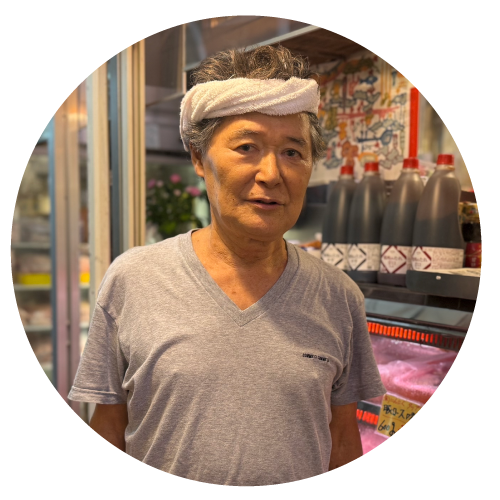 儀武息慶さん(77歳)栄町市場にて『栄町ミート』を経営。「ふるさとで小さい頃に見てきたまちの景色を色々描いていますが、これからも描いていきたいと思います。」
